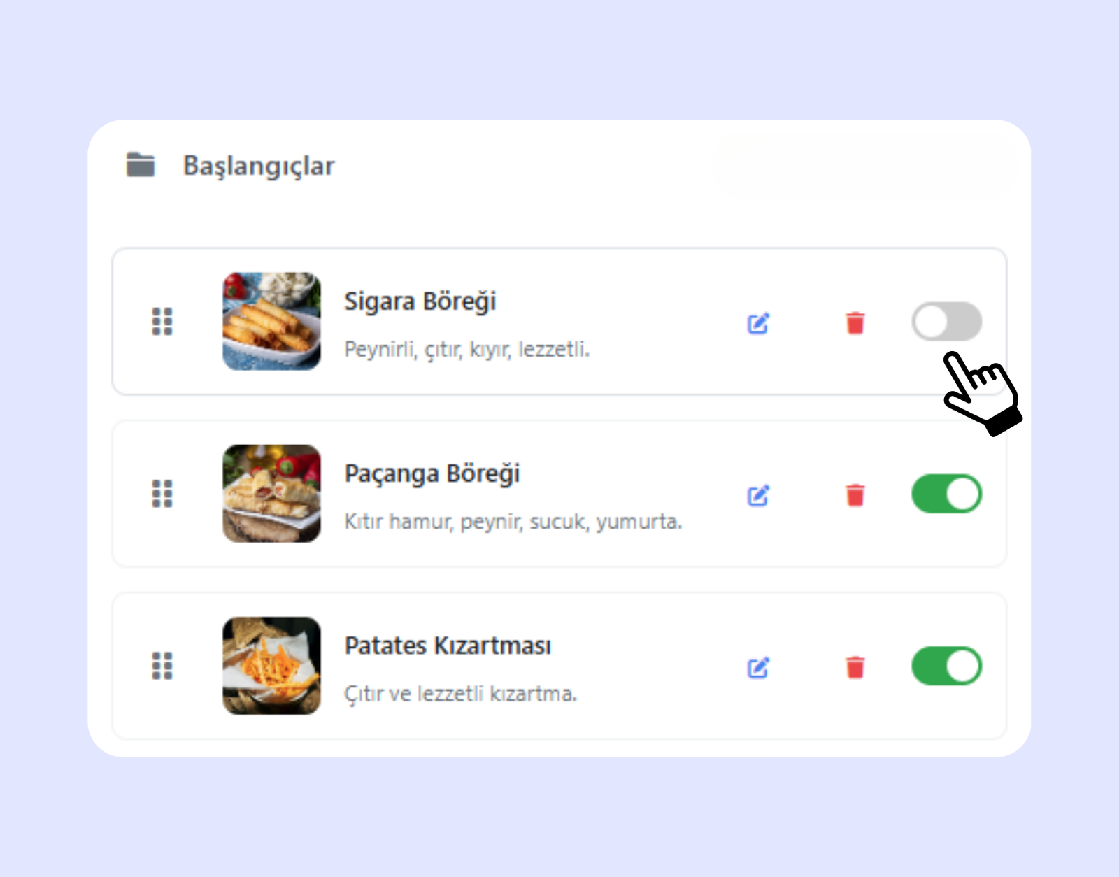 Aktif – pasif özelliğiyle ürünleri tek tıkla değiştirebilirsiniz. Canlı yansımalar sayesinde anında güncellenir. Müşterileriniz her zaman güncel menüyü görür. Kolay kullanım ile tam kontrol sizin elinizde.