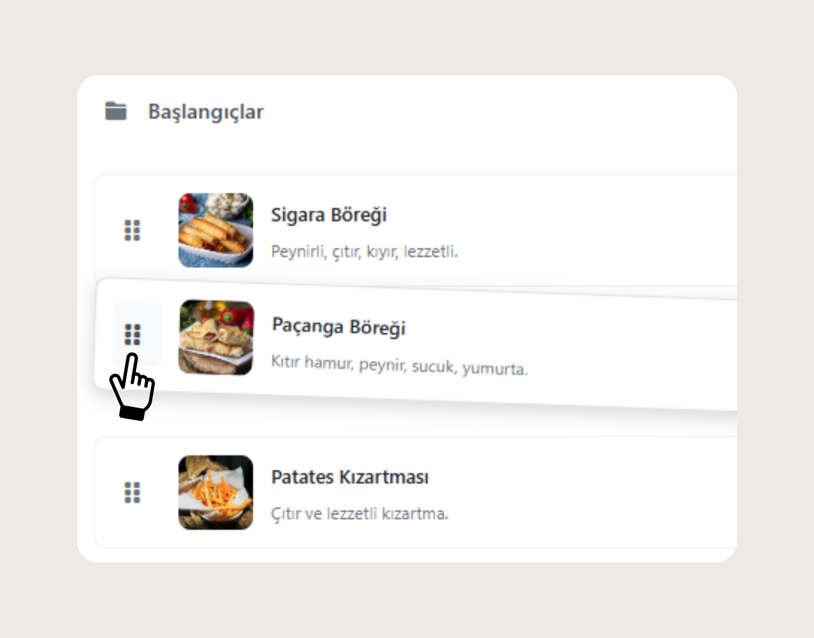 Ürünlerinizi kolayca yönetin. Ürünü sürükleyip bırakarak sıralamayı değiştirin. Menünüzü saniyeler içinde düzenleyin. Zaman kazanın, kontrol hep sizde olsun. Kolay mobil uygulama ile menülerinizin sıralamasını istediğiniz gibi kontrol edin!